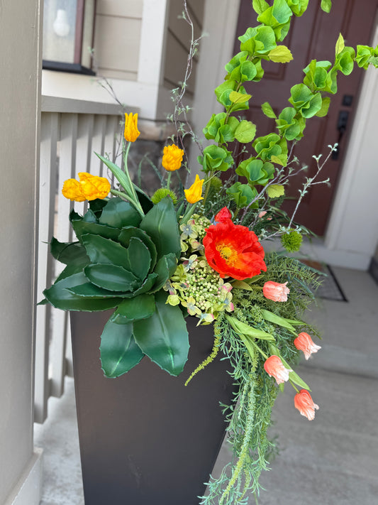 Custom seasonal outdoor containers, fresh or faux, designed to elevate your space year-round.