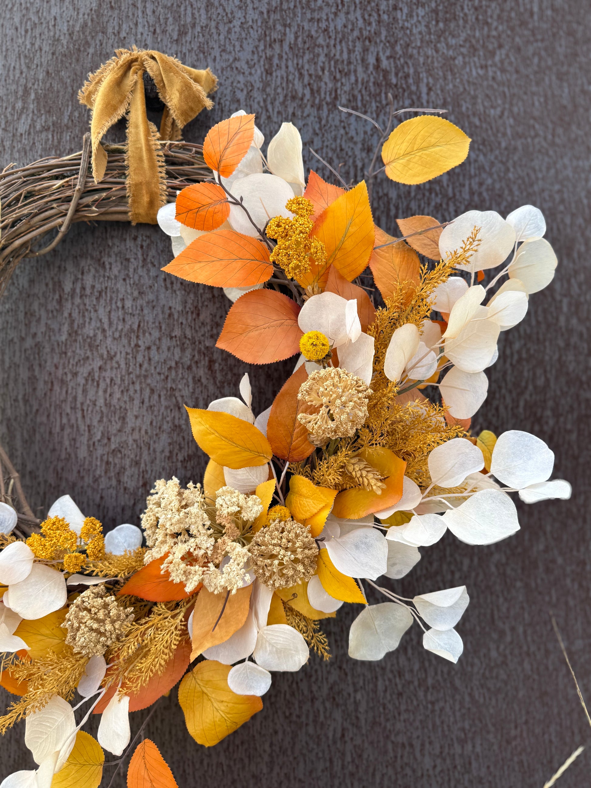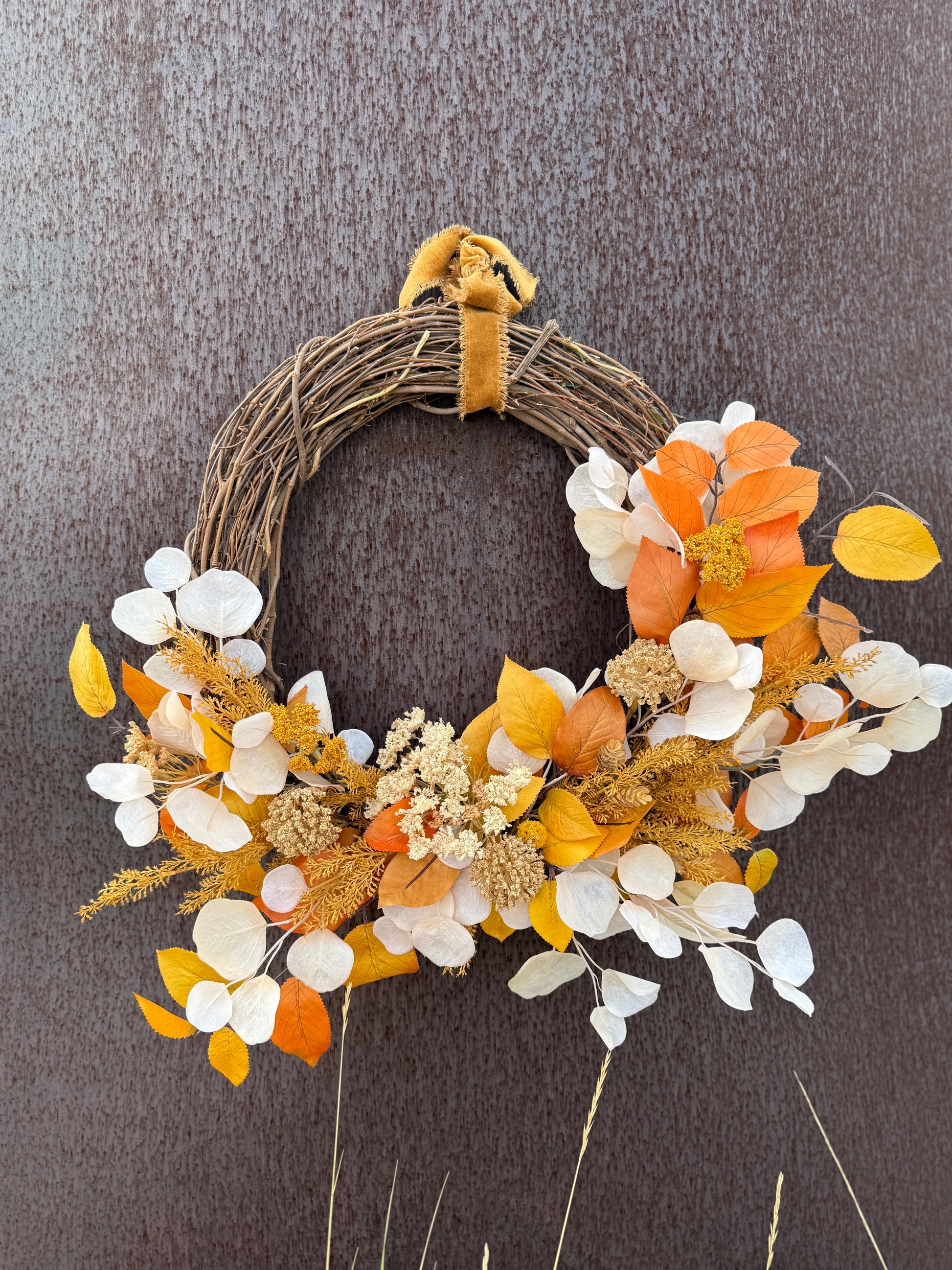 This wreath is a warm and elegant tribute to the beauty of autumn. Amber Meadow features lifelike real-touch stems nestled among golden aspen leaves, wispy pampas grass, and a soft blend of wildflowers with warm orange and yellow hues. It brings a gentle yet striking presence to your space—like a walk through a glowing fall meadow at golden hour. Finished with a beautiful ribbon for hanging, this handcrafted wreath adds a natural and welcoming touch to any home as the seasons change.