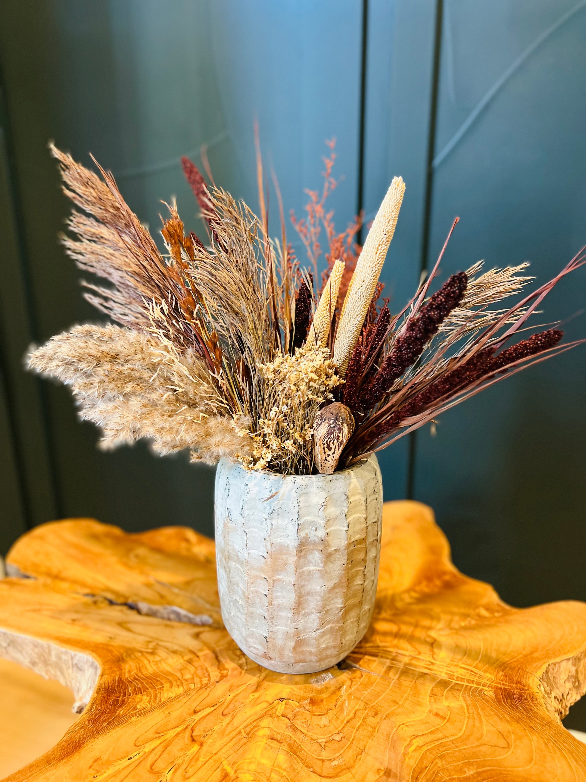 Our Dried Floral Everlasting Arrangement is stunning centerpiece that brings warmth to any neutral space. Pampas Grass, Pods, Millet Grass, Folliage all styled in a sleek, ceramic brown/golden vase.