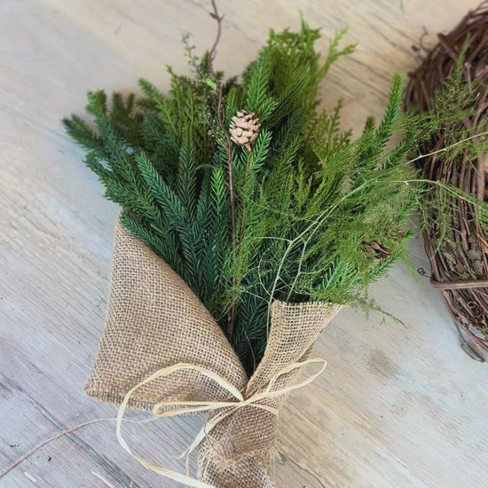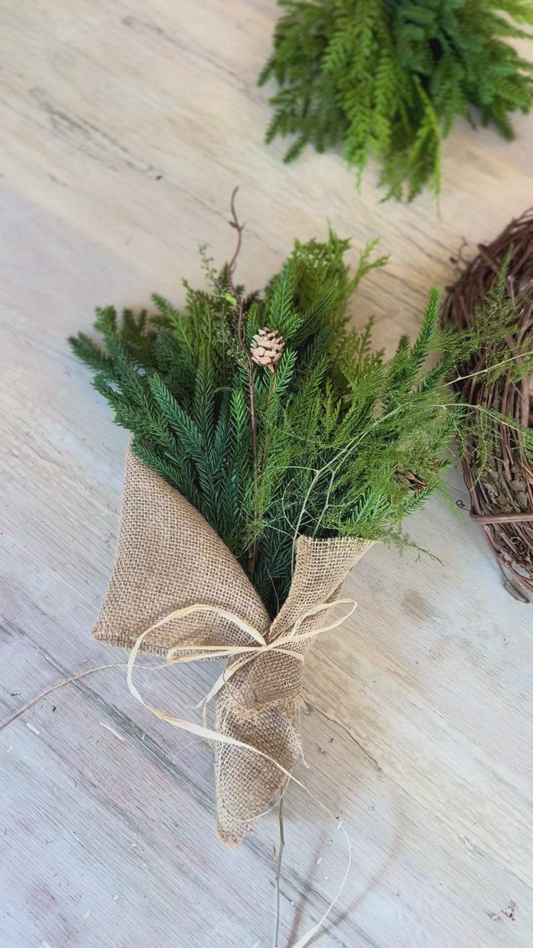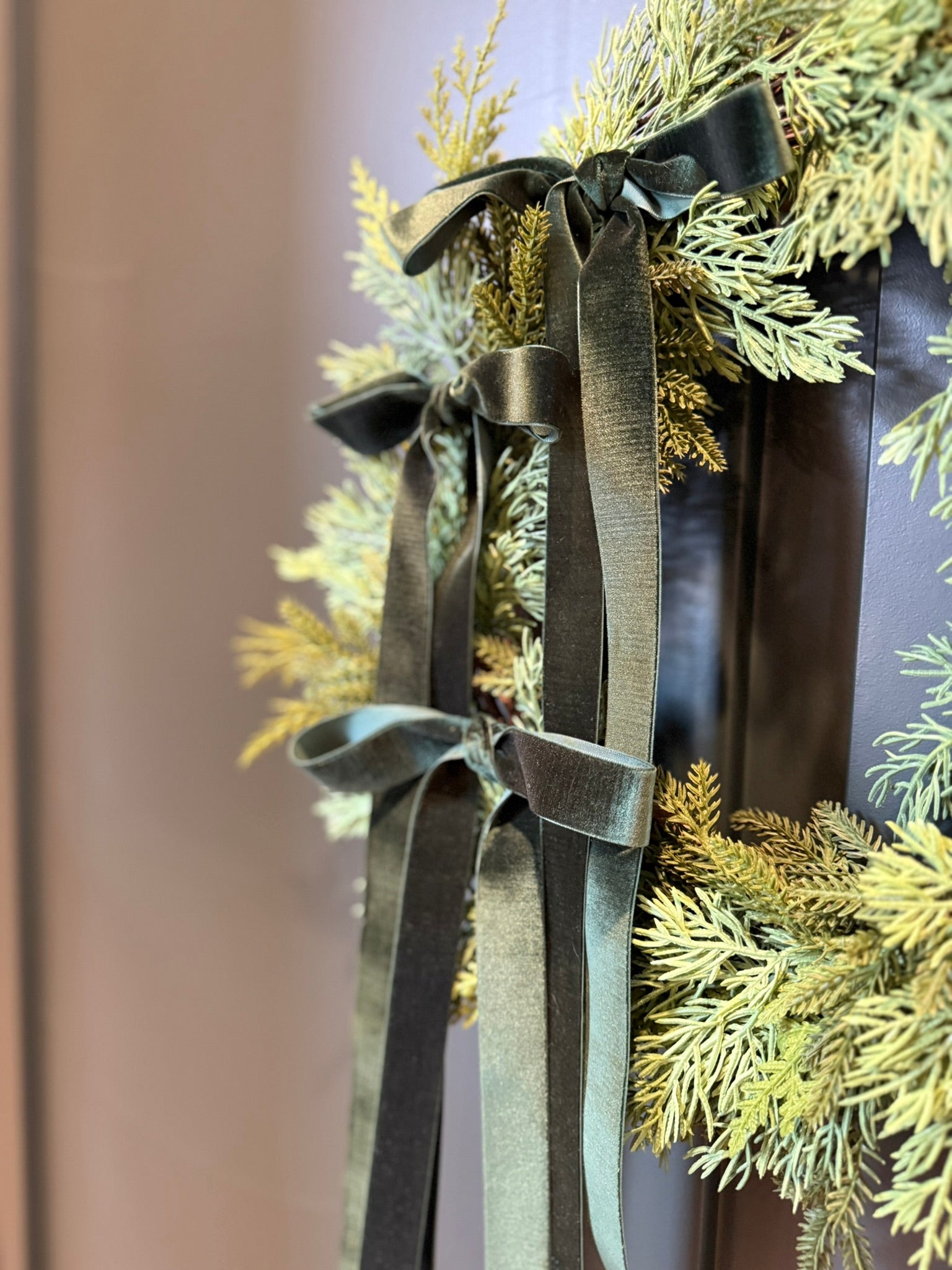 We’ll be building gorgeous wreaths from scratch—starting with a 14" grapevine base and filling them in with high-quality faux greenery like Norfolk, Cedar, and Pine and juniper berries that look real but can be reused year after year.