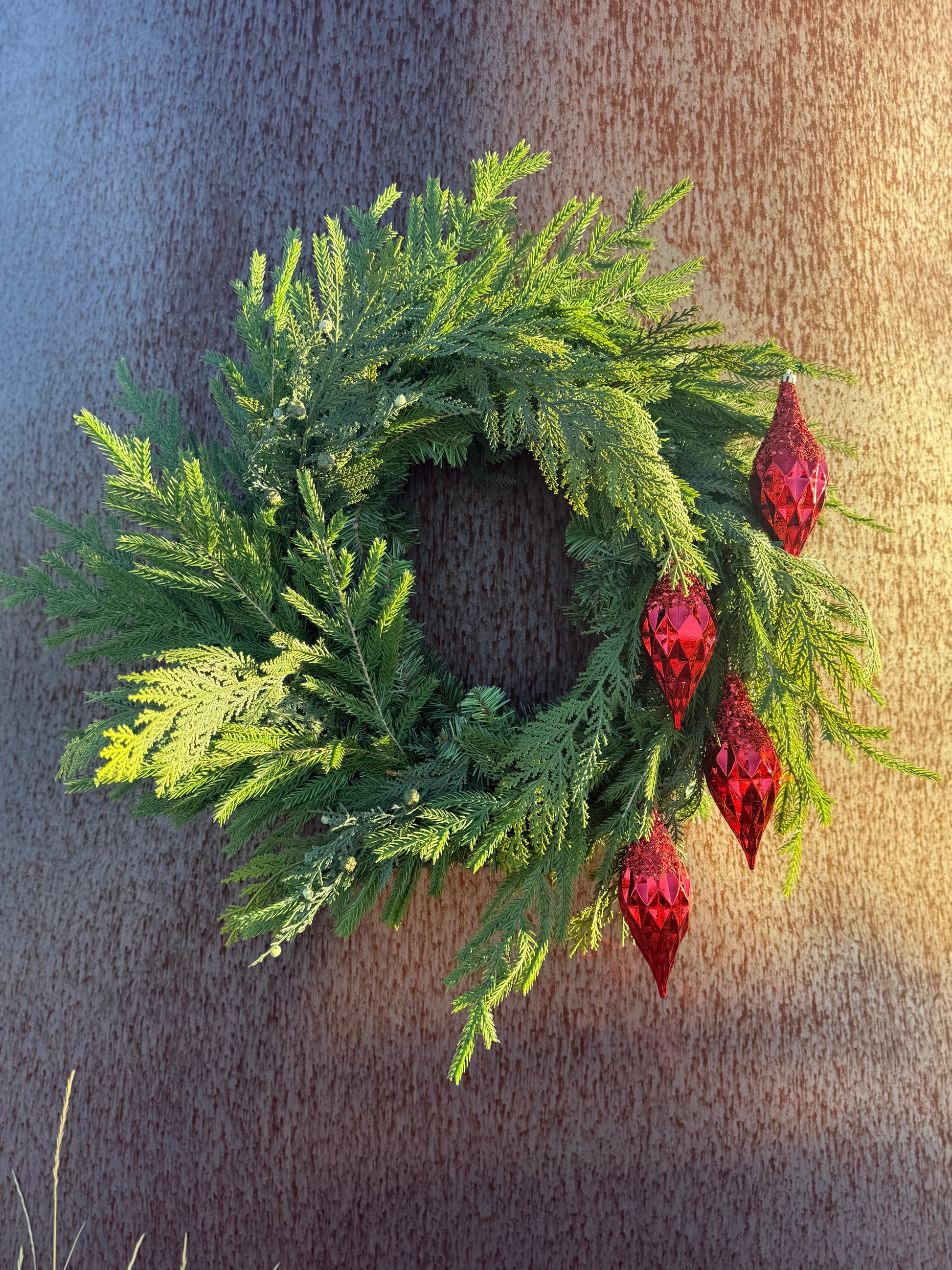 Celebrate the season with timeless elegance and a touch of holiday sparkle. Crafted from lush layers of lifelike cedar and Norfolk greenery, this wreath brings rich texture and fullness to any space. Four radiant crimson drop ornaments add a warm, refined glimmer, catching the light with effortless charm. A stunning statement for your door, entryway, or mantle — where classic greenery meets festive brilliance.