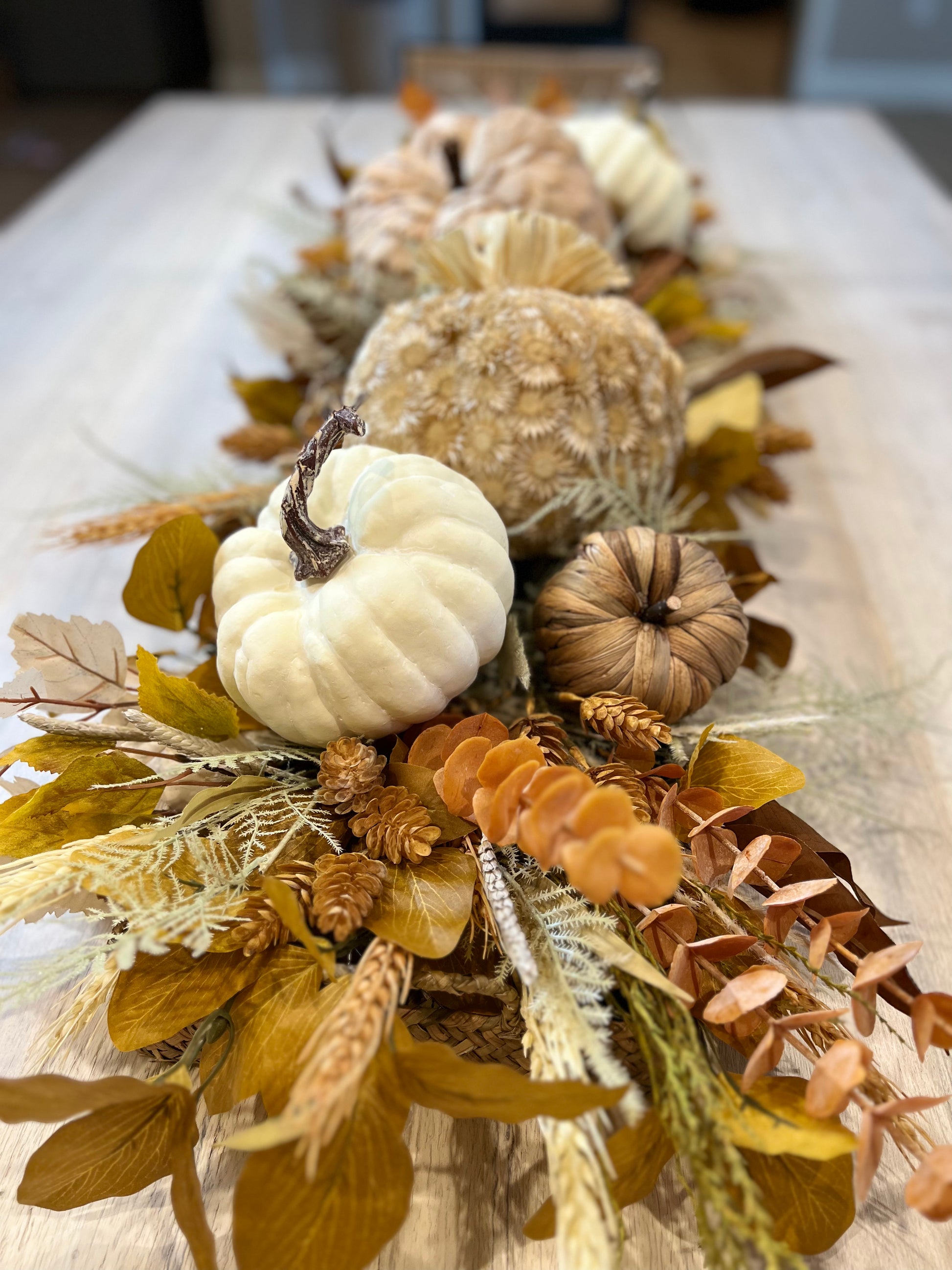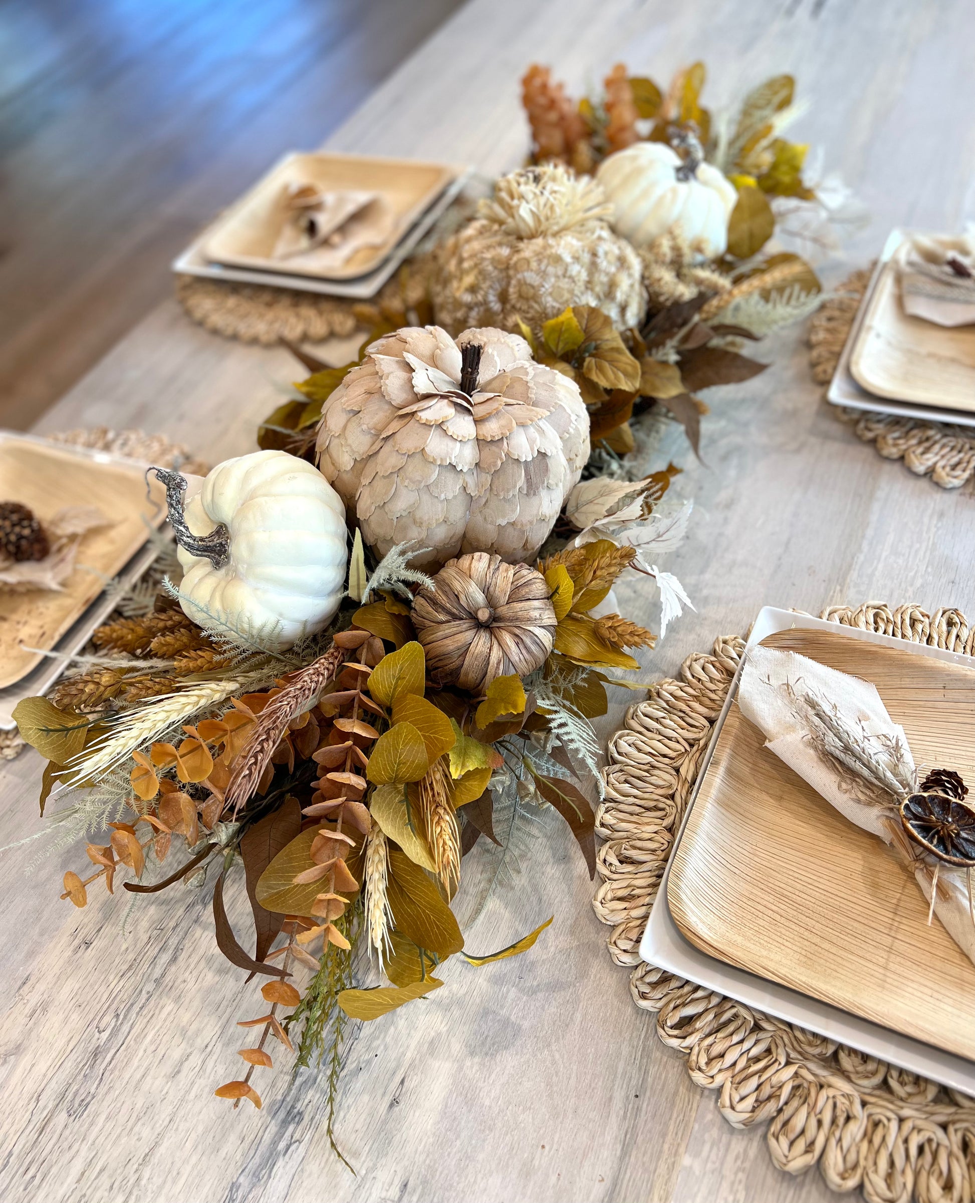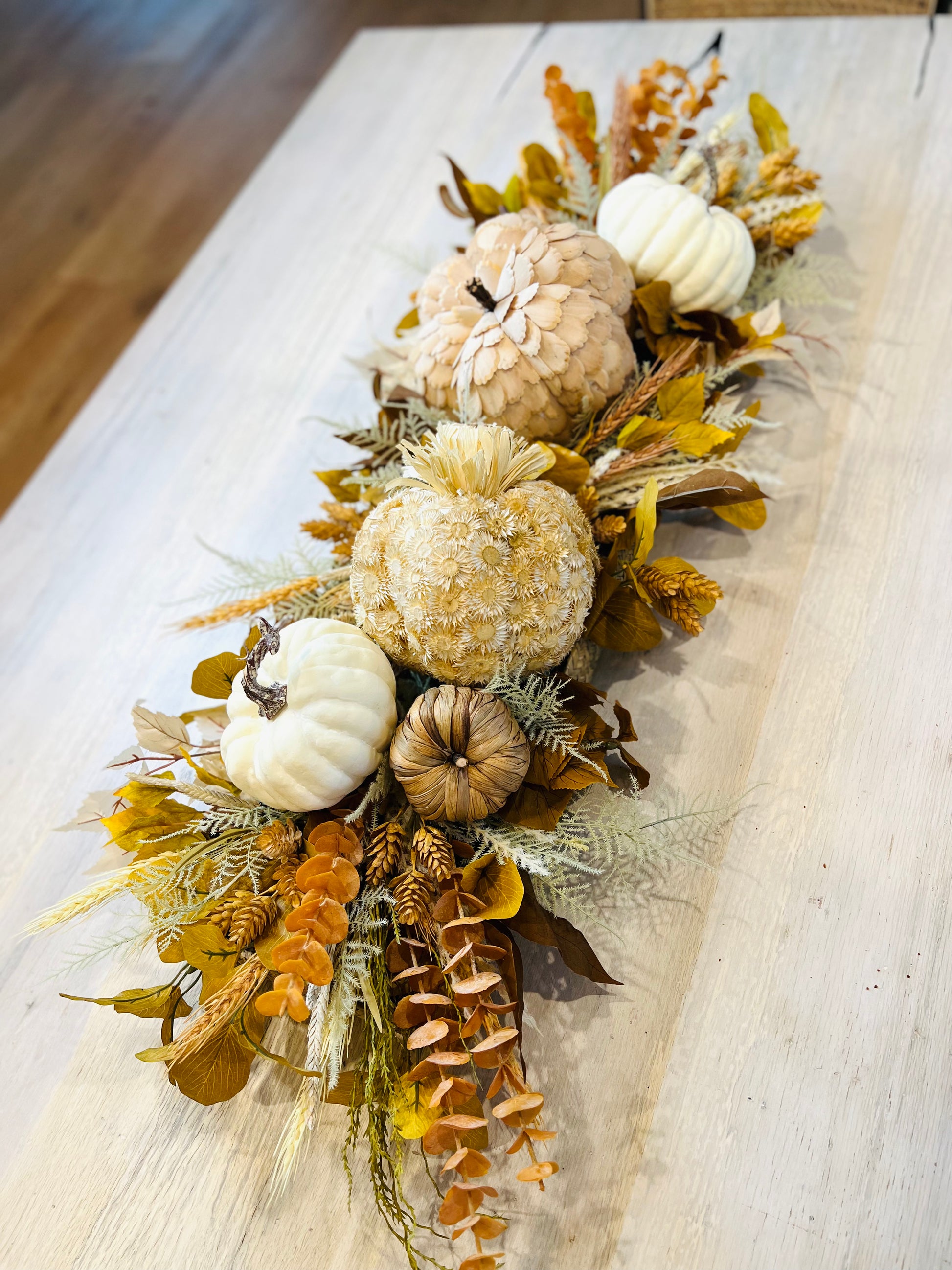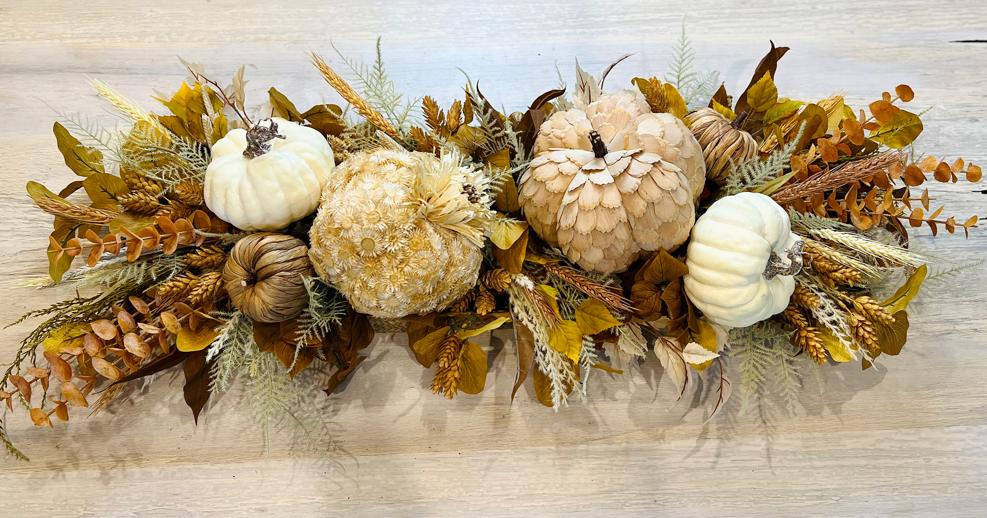This centerpiece is a beauty! Neutral textured pumpkins, eucalyptus, mix of leaves, and colorful wheat and hops. This Centerpiece will dress up your table all fall long. A stunning centerpiece for Thanksgiving that your guests will love!