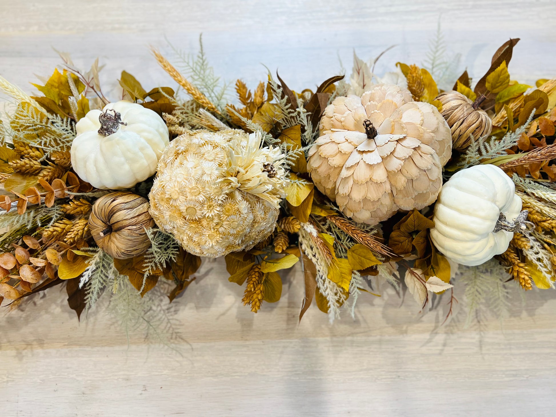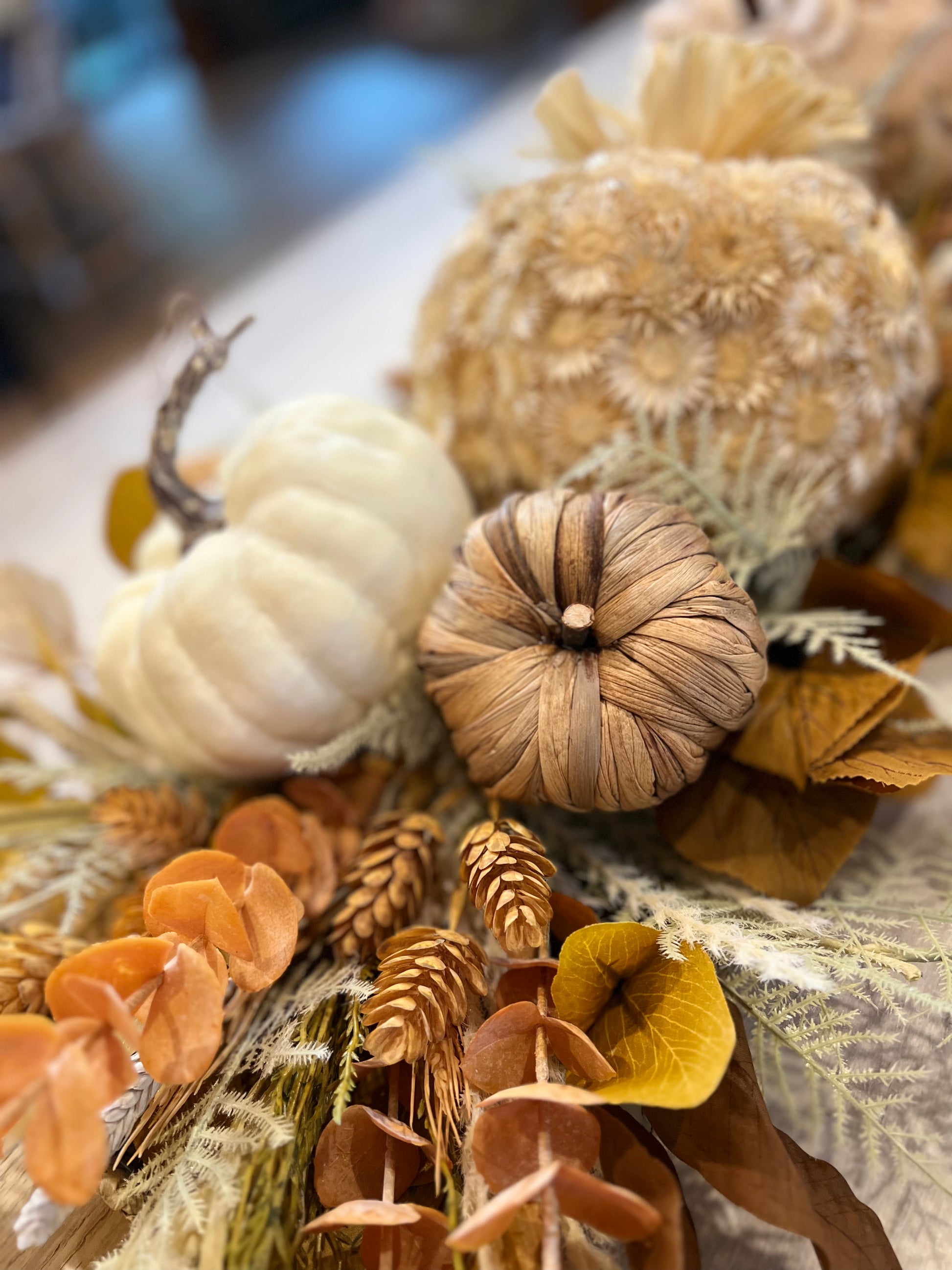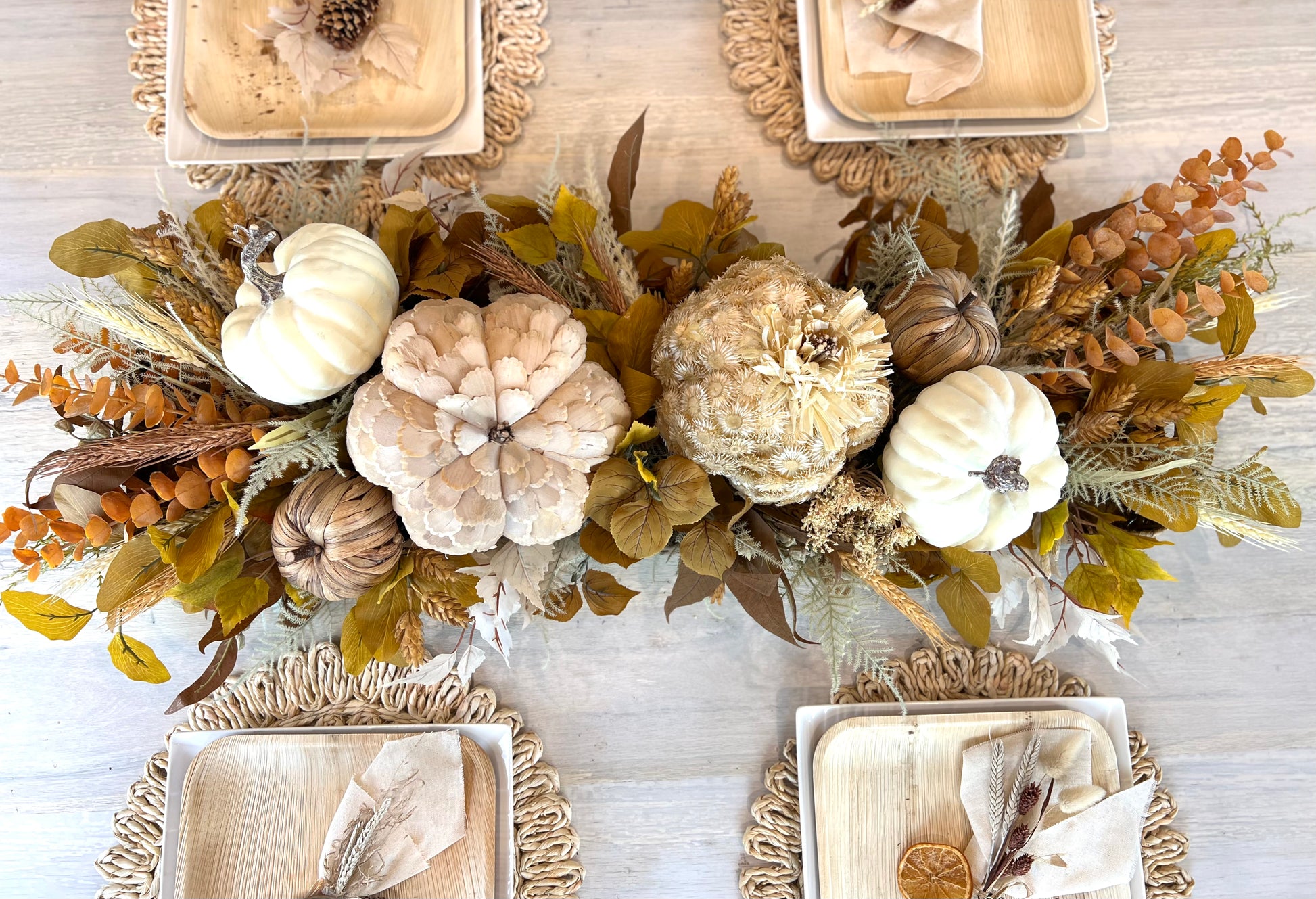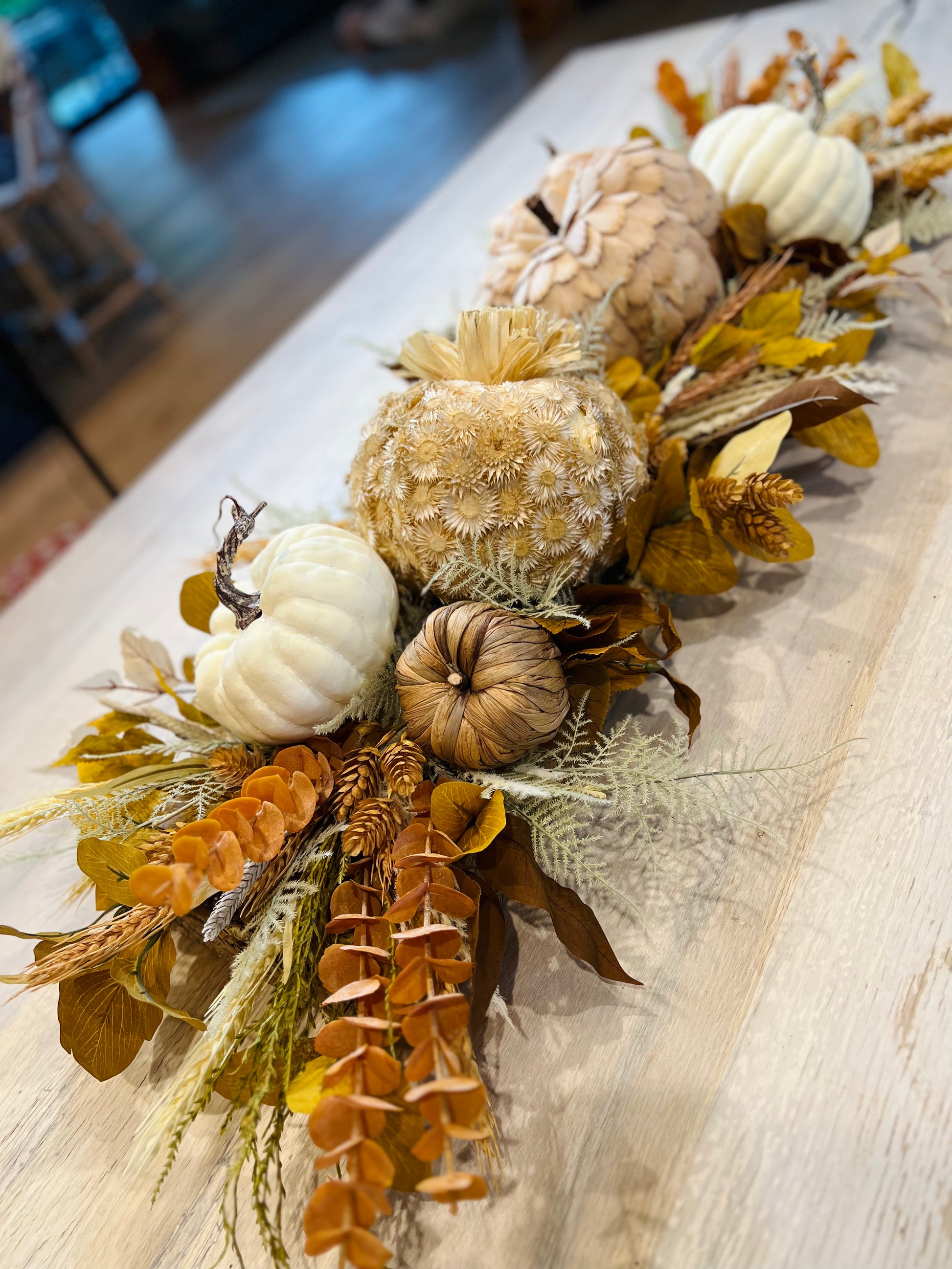 This centerpiece is a beauty! Neutral textured pumpkins, eucalyptus, mix of leaves, and colorful wheat and hops. This Centerpiece will dress up your table all fall long. A stunning centerpiece for Thanksgiving that your guests will love!