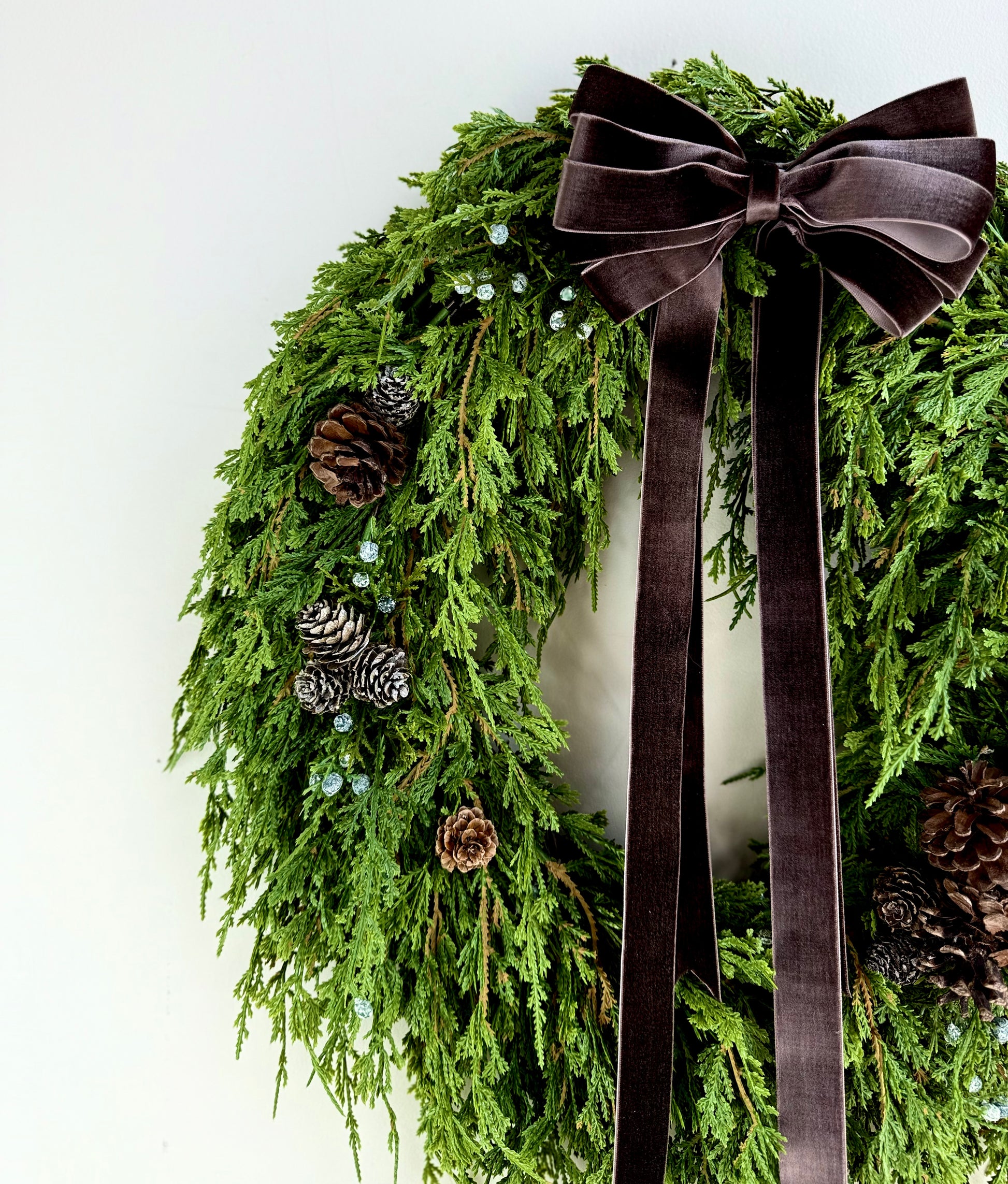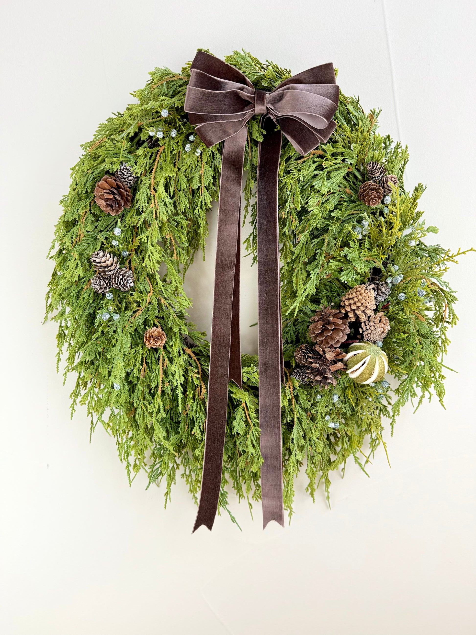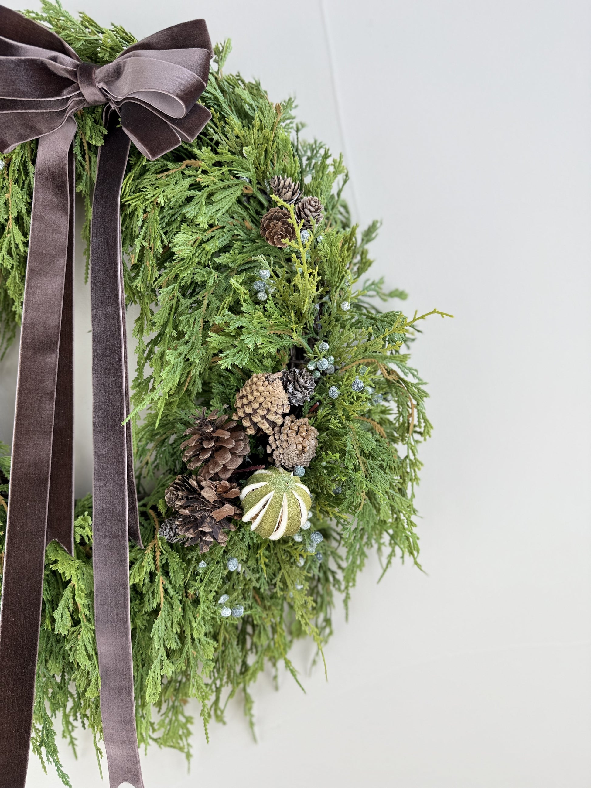 Bring a touch of elegance to your home with our stunning Real Touch Cedar Wreath. This handcrafted piece, made to order in our Denver studio, features a luxurious cognac velvet bow, adding a rich and sophisticated touch. Adorned with preserved limes, juniper berries, and a charming mix of pinecones, this wreath is perfect for any season.