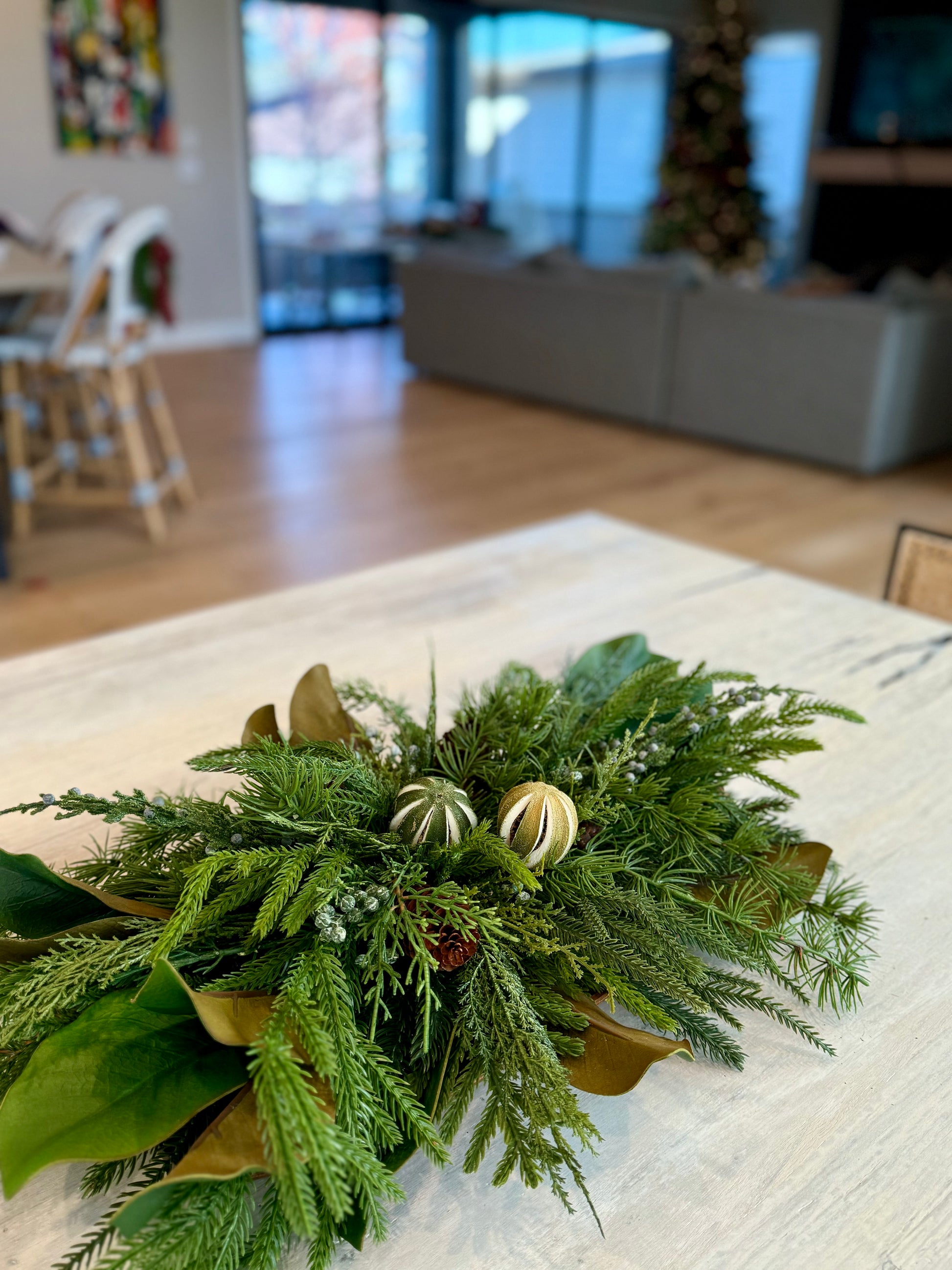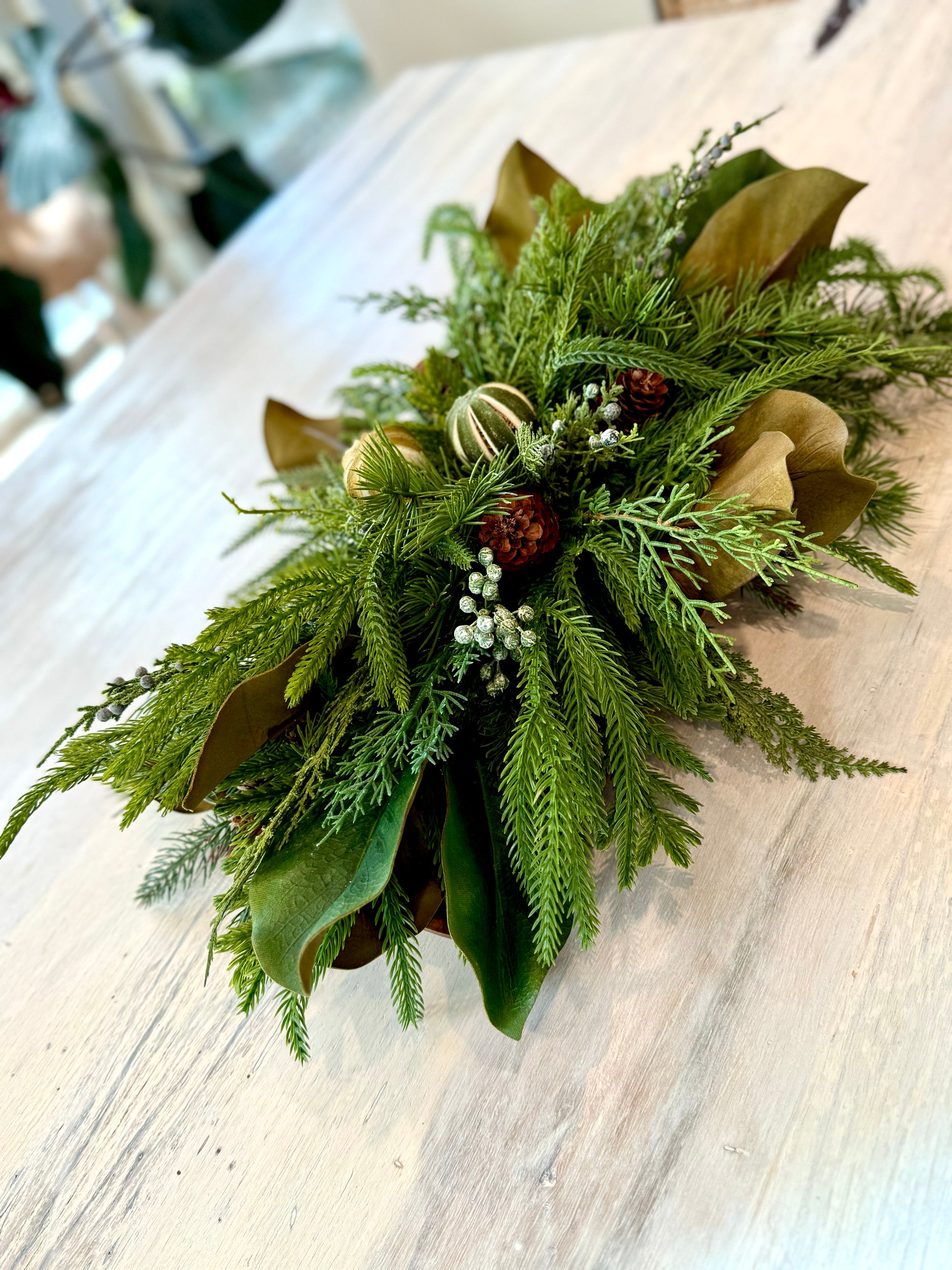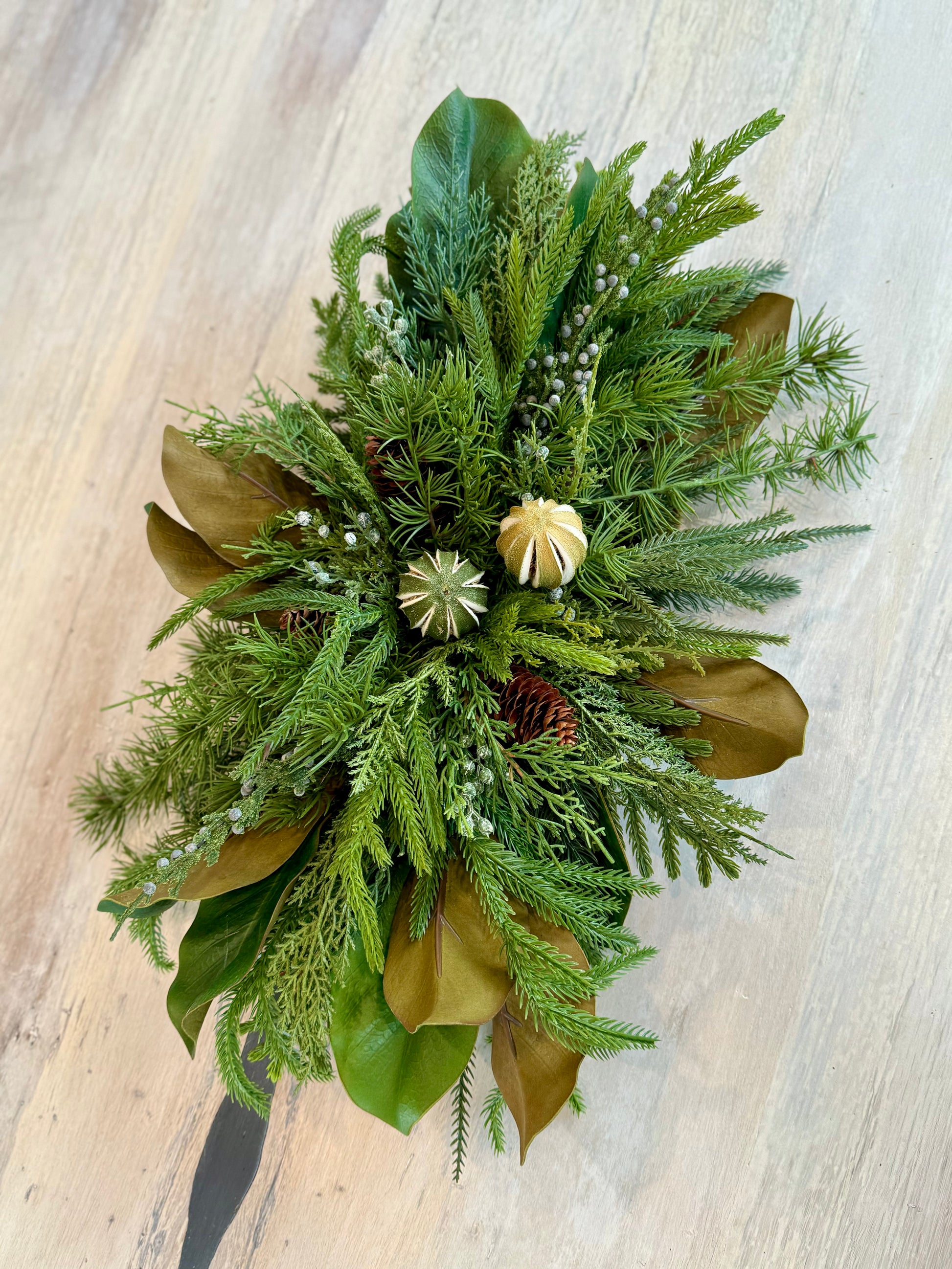 Features: Real-touch pines, Norfolk pine, magnolia leaves, juniper berries, and preserved limes.