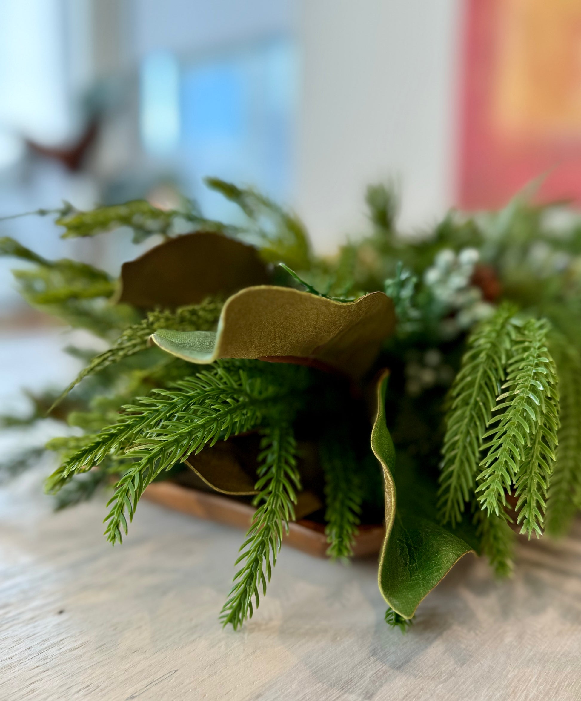Description: Embrace the beauty of winter with this stunning arrangement, artfully styled in a rustic wooden tray. Featuring lifelike real-touch pines, vibrant Norfolk pine, and elegant magnolia leaves, this arrangement is beautifully accented with juniper berries and preserved limes. P