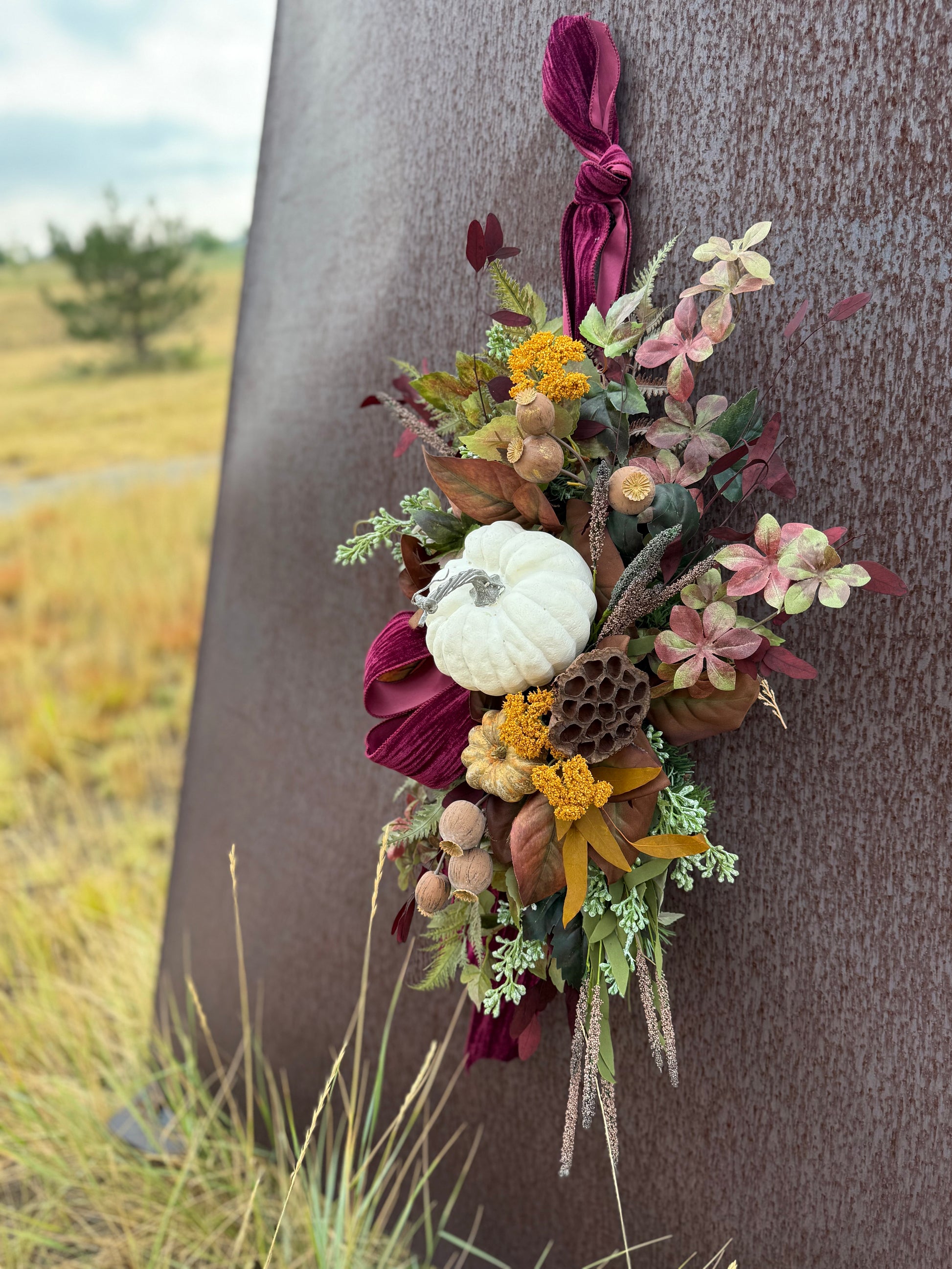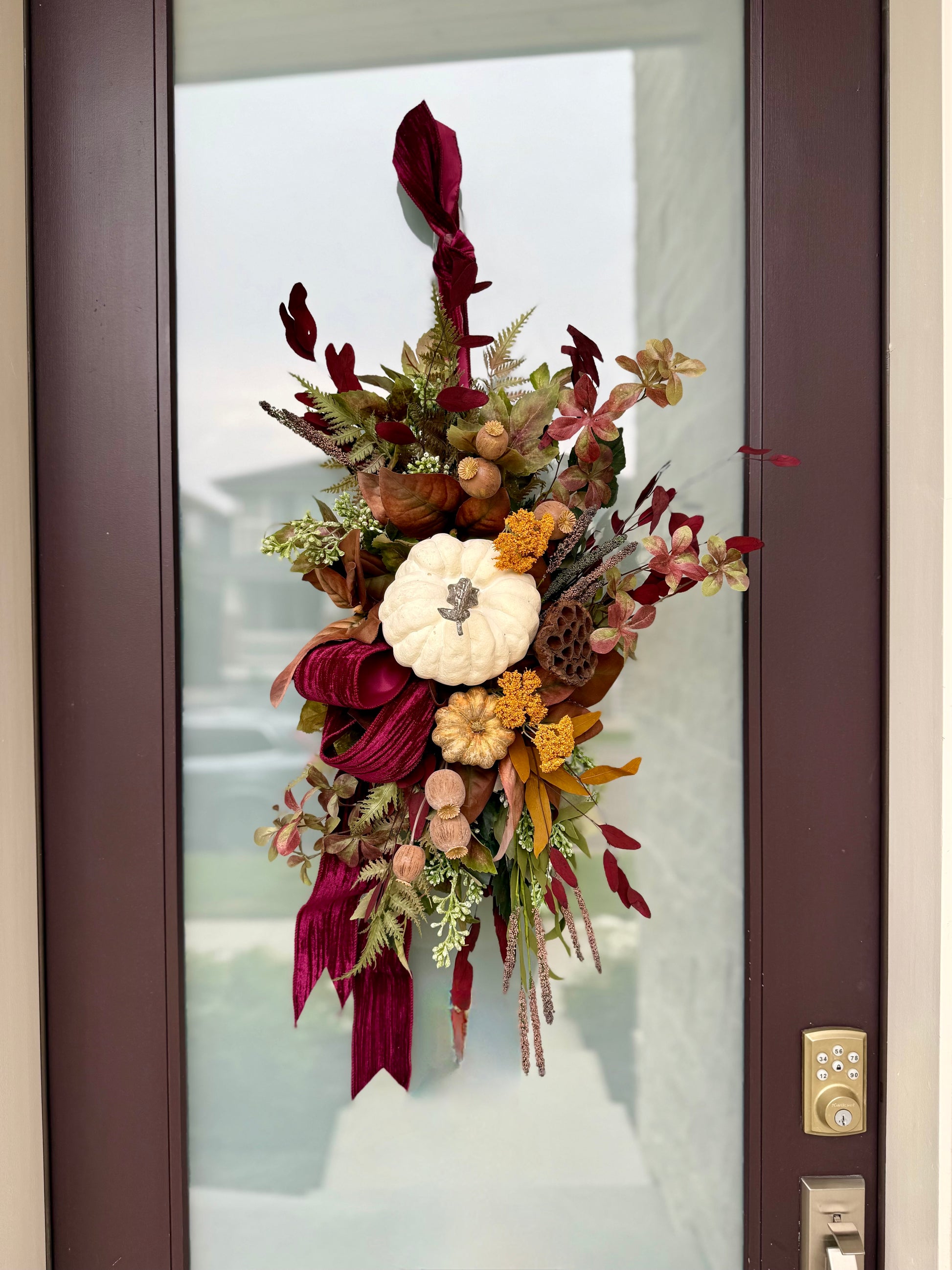 Features: White pumpkin, rich fall foliage, seasonal florals in autumn tones, 4" burgundy velvet ribbon, swag design