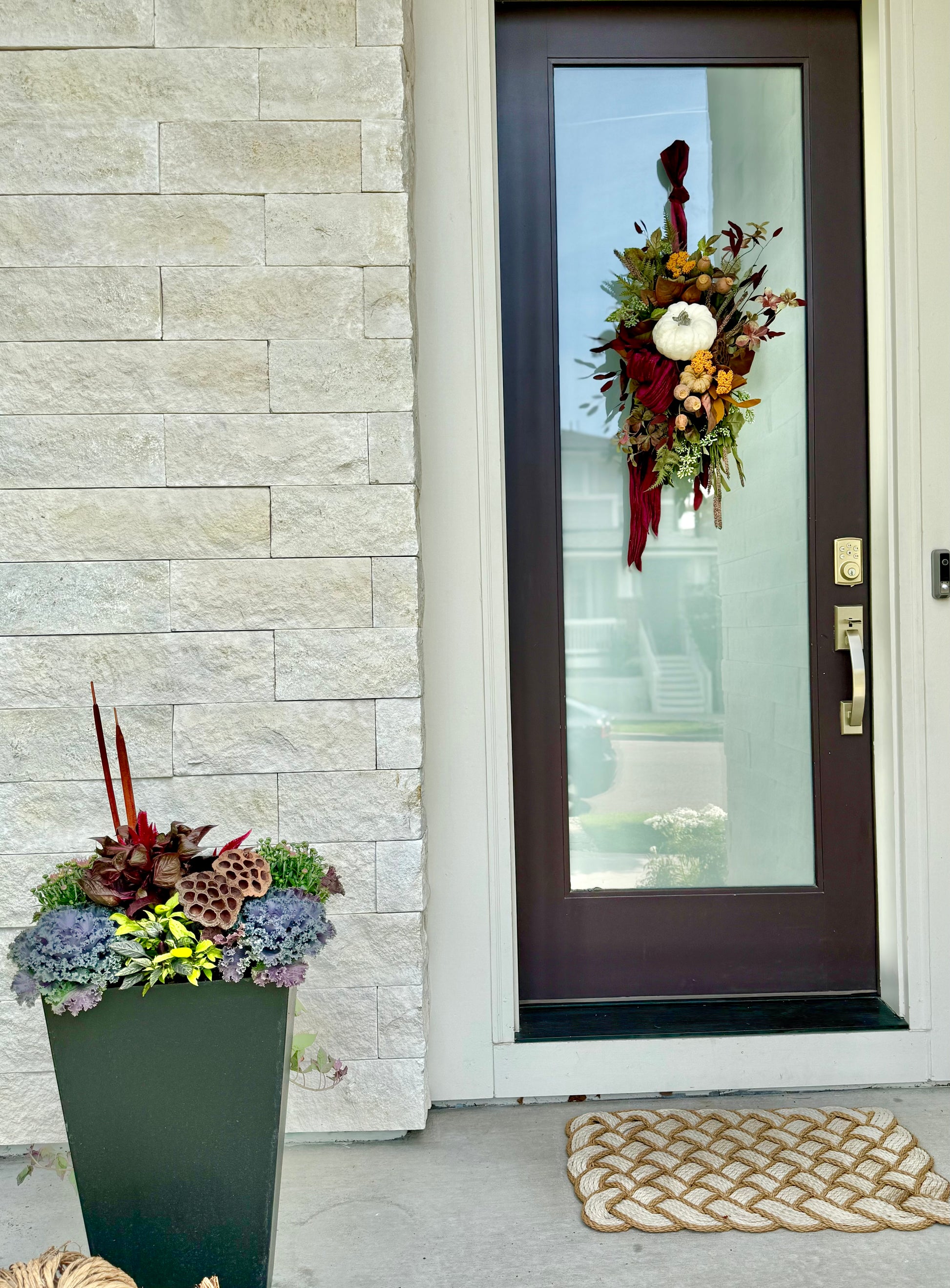Looking to make your porch beautiful? Let us design a custom container to perfectly complement your swag and wreath, creating a coordinated and stunning fall display!