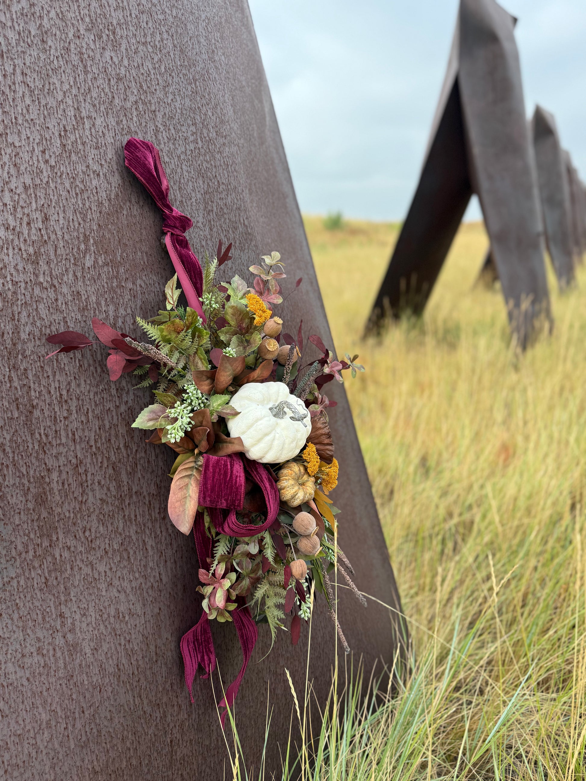 Velvet Harvest is a refined take on fall decor—designed as an elegant swag that brings warmth and sophistication to your front door. Centered around a soft white pumpkin and bursting with lush fall foliage and florals in deep, seasonal hues, this piece is finished with a show-stopping 4" burgundy velvet ribbon. It's the perfect statement for those looking for something both unique and timeless.