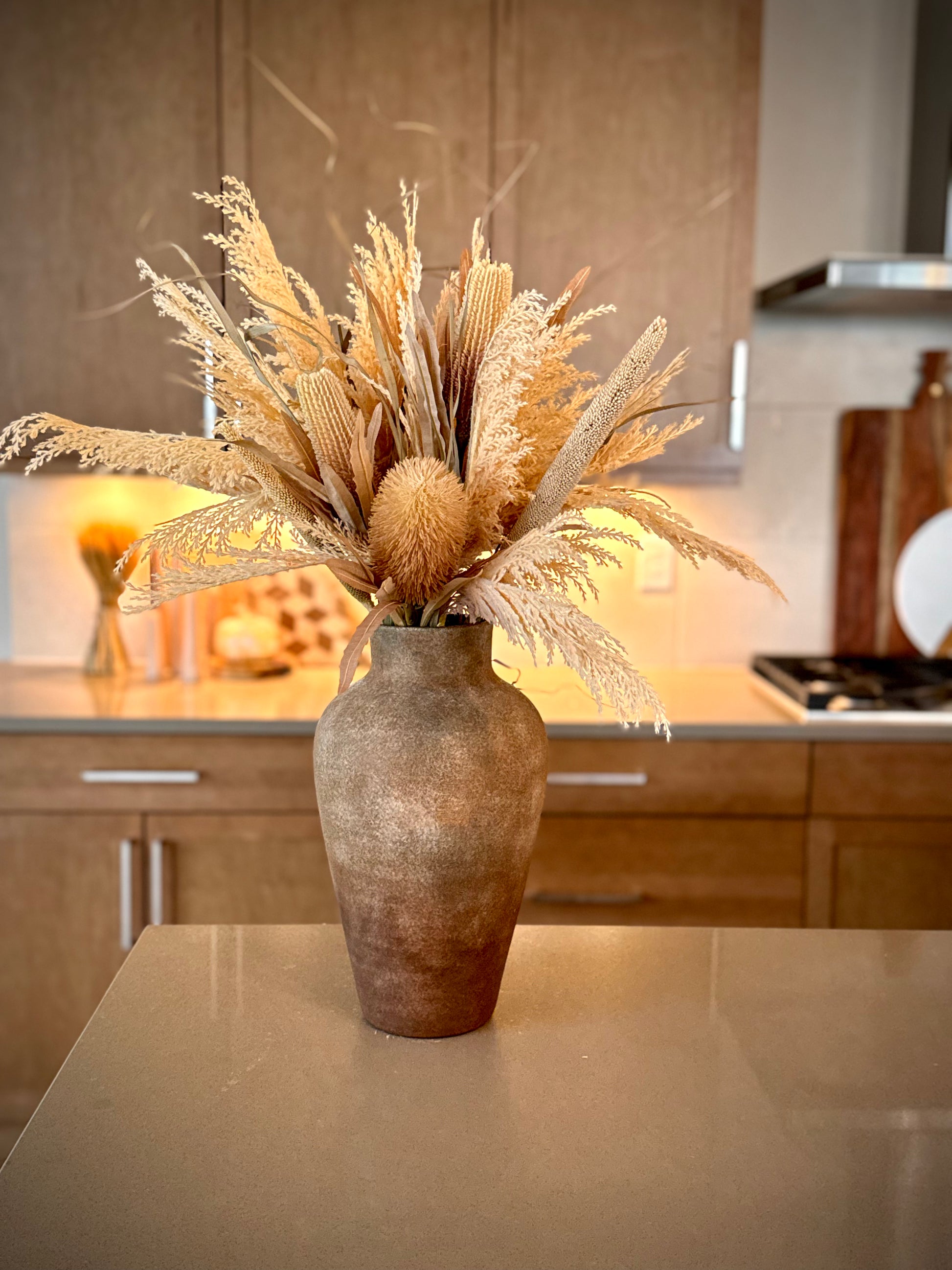 Bring soft, organic texture into your home with this neutral, warm floral bundle. Featuring lifelike banksia paired with feathery pampas grass, it adds understated elegance and warmth to any space. Each stem is crafted to look and feel realistic, and the bendable stems make it easy to shape or trim to fit your favorite vase or seasonal centerpiece.