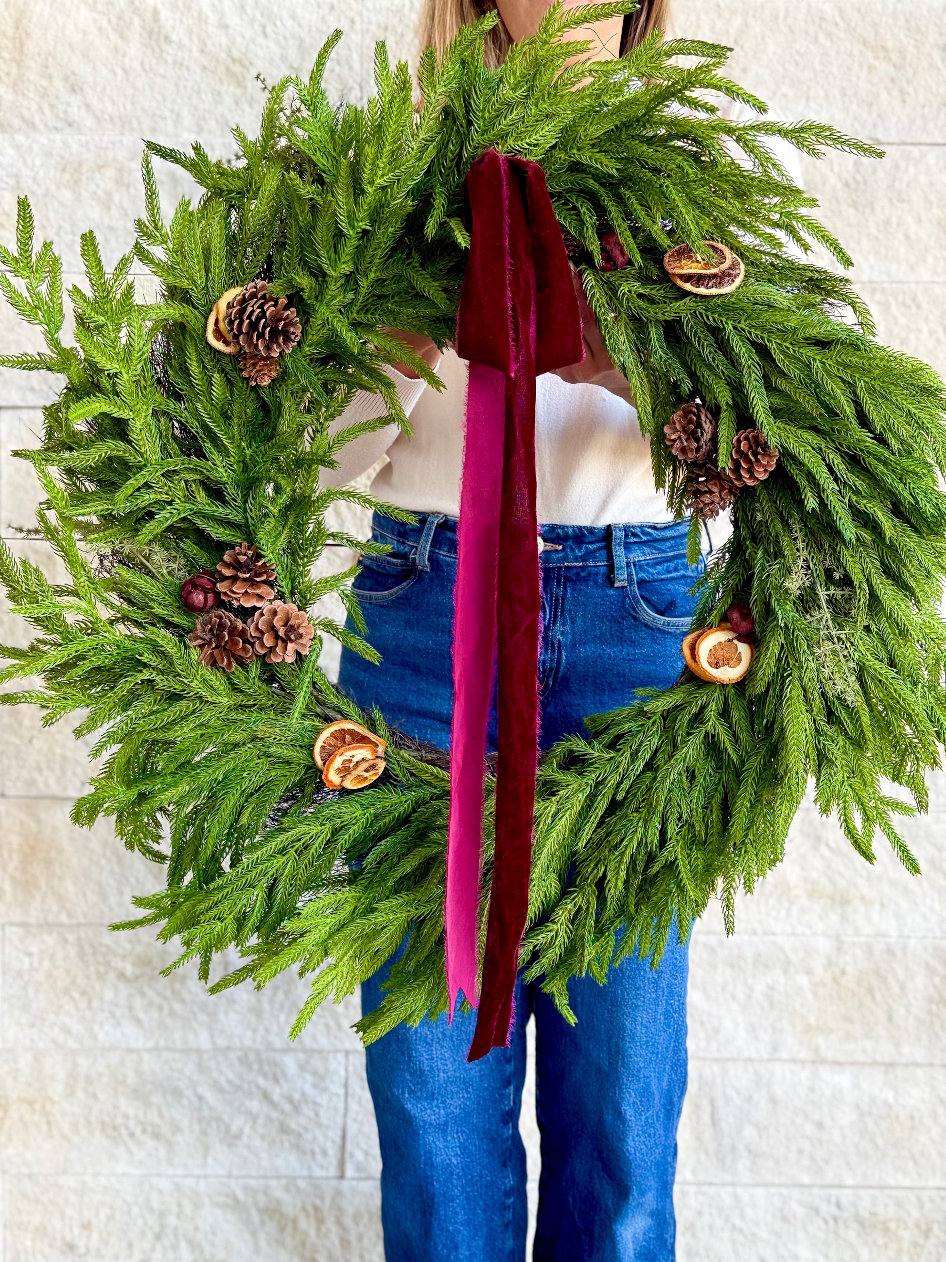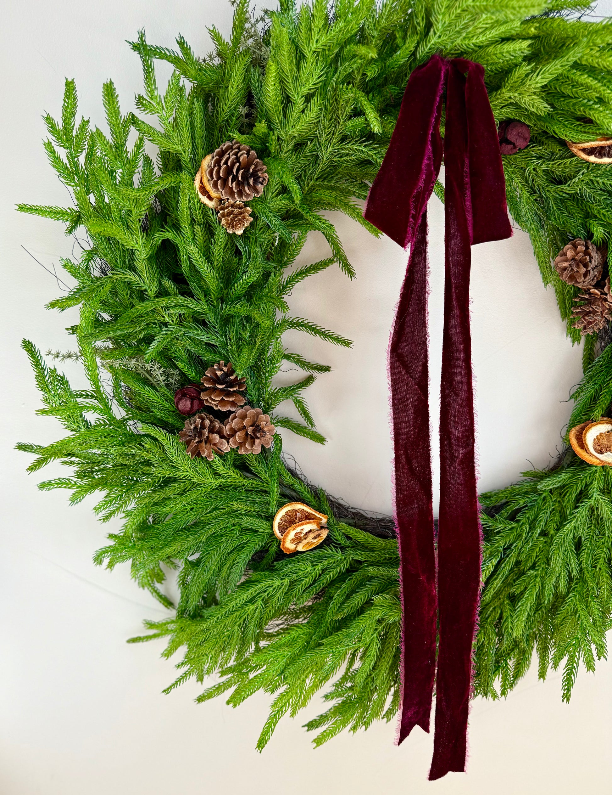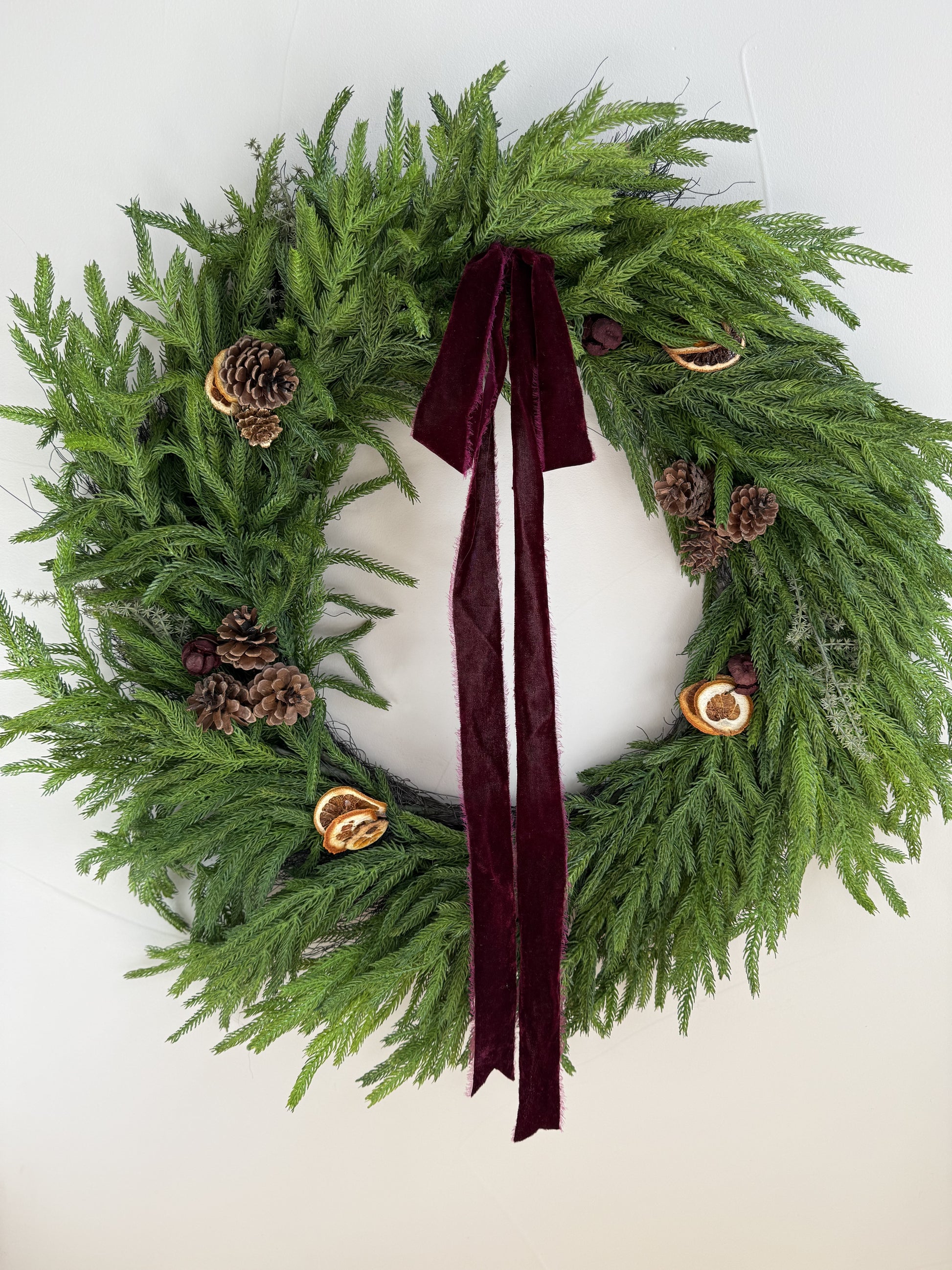 - Description: Make a bold statement with our XL Real Touch Norfolk Wreath! This stunning piece features realistic real touch foliage, beautifully accented by a rich burgundy velvet ribbon. Adorned with dried oranges, charming pinecones, and a sprinkle of red berries, this wreath is perfect for bringing warmth and festivity to your home during the holidays and beyond.